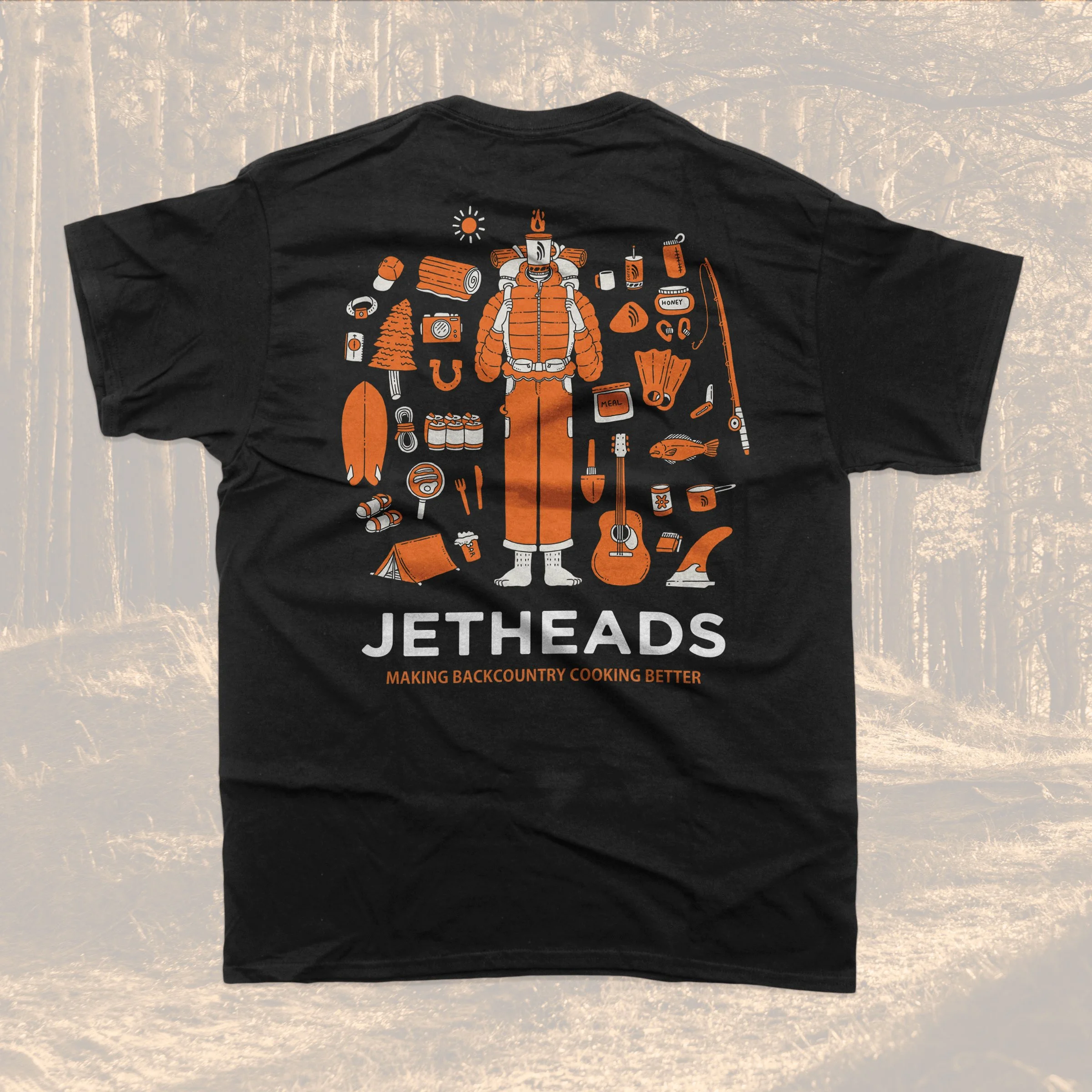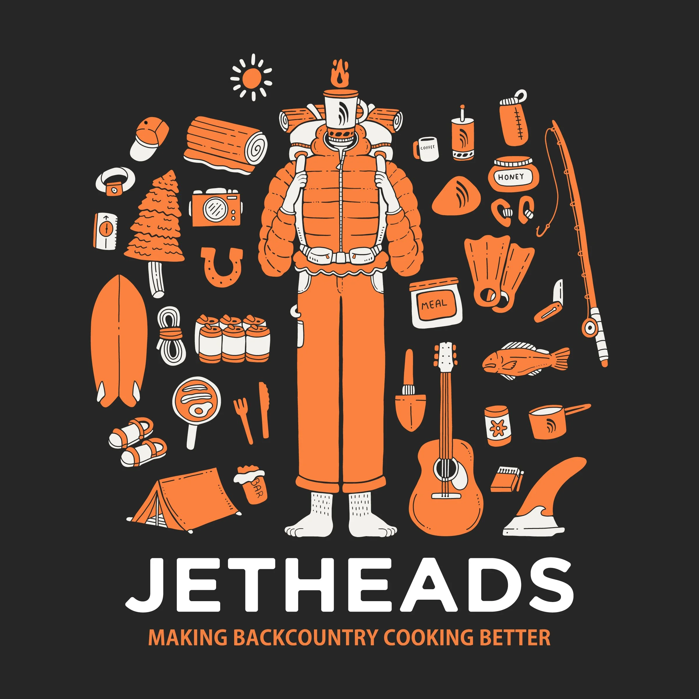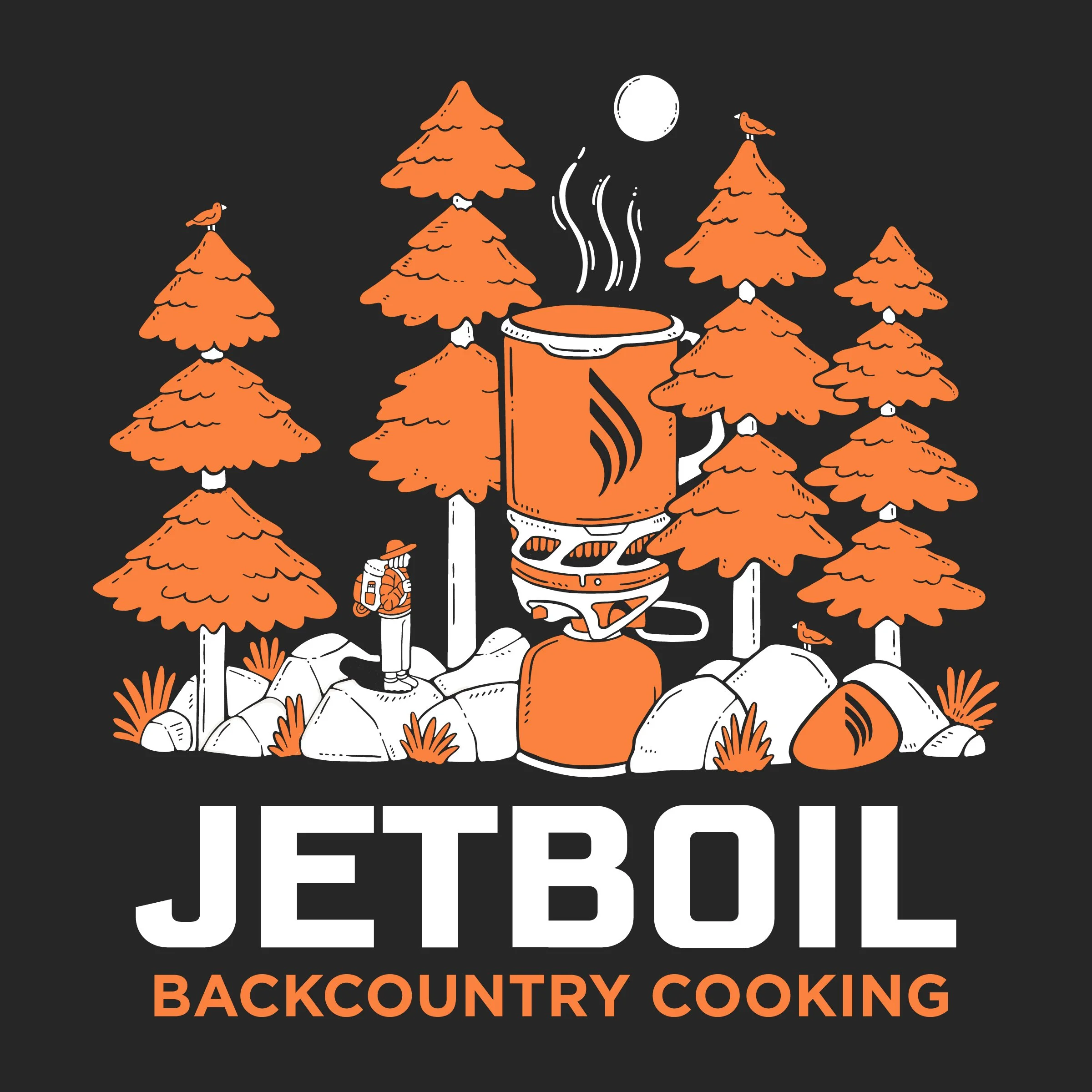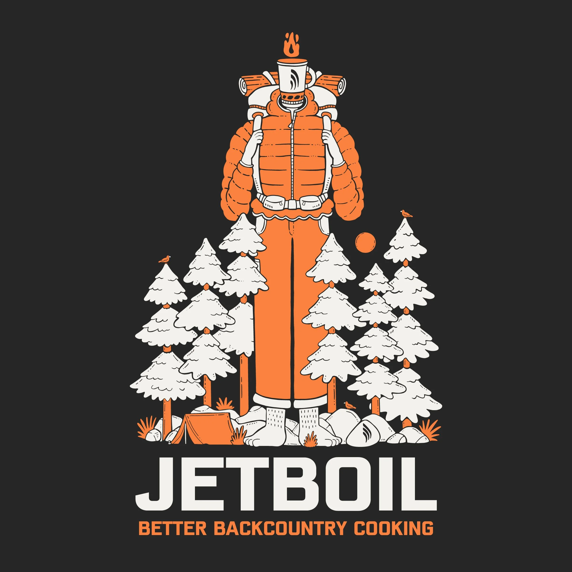 Partnering with Jetboil, one of the premier outdoor cooking system companies, to craft three distinct, fun, and approachable apparel graphics. These designs showcased the company's exceptional products and featured a charming portrayal of their mascot, the Jethead, engaged in backcountry cooking adventures. Adhering closely to the brand's color palette and typographic choices, we developed three individual graphics that perfectly encapsulated Jetboil's core identity of providing cutting-edge technology for crafting delicious meals in the outdoors.